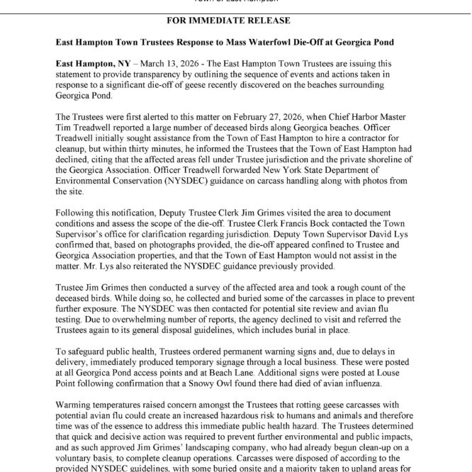 East Hampton Town Trustees Respond to Mass Waterfowl Die-Off at Georgica Pond East Hampton, NY – March 13, 2026 – […]